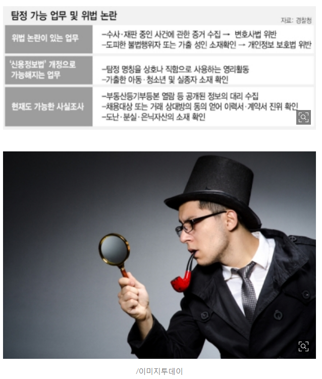 첫발 뗀 '탐정'...증거수집 합법성 여전히 모호 2025.05.12 관리자 0 92 지난 3일 서울 서대문구의 한 골목. 먹다 남은 도시락, 빈 음료수병이 가득한 승용차에서 ‘서현우 탐정사무소’ 소속 탐정인 서현우(가명)씨와 김재훈(가명)씨가 카메라를 들고 주택을 뚫어지게 쳐다보고 있었다. 80억대 금융사기범을 잡아달라는 의뢰를 받고 잠복근무를 하던 중이다... 자세히보기--> https://n.news.naver.com/article/01…