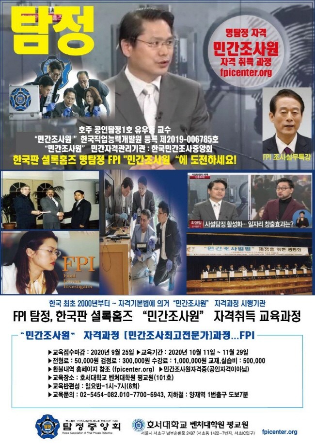 탐정중앙회(회장 유우종)는 10월 11일부터 11월 29일까지 ‘FPI(민간조사최고전문가) 자격취득 과정’을 시행한다고 14일 밝혔다.